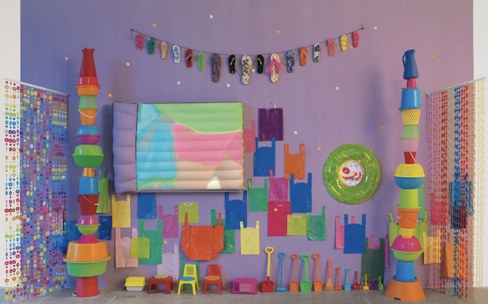 Dans la même salle, Pingpong, tong et camping nous amuse avec ses éléments en plastique coloré. Cette salle joyeuse succède à la mélancolie du Dépôt de la cabane de plage, installation qui nous montre des actualités tristes du monde.