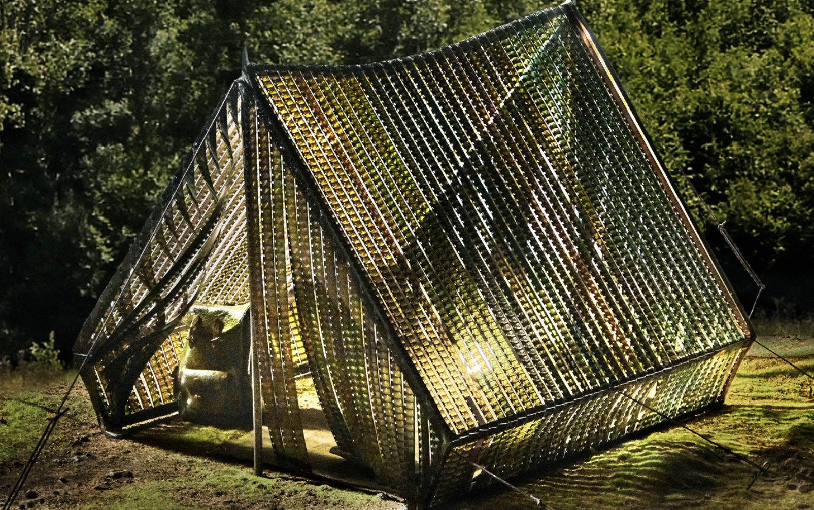 Domergue une série de photographies de cabanes prises par Agnès en 2005 et 2006 pour le catalogue de son exposition « L’Île et Elle » à la Fondation Cartier pour l’art contemporain et, en face, une nouvelle cabane : La Tente de Sans toit ni loi.