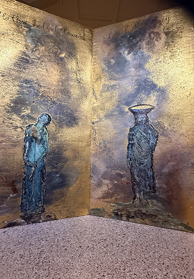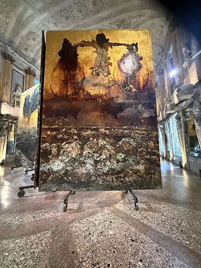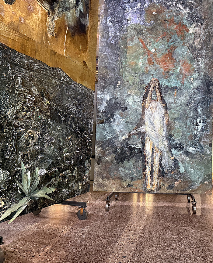 Ils s’extraient de l’épaisse couche picturale chère à l’artiste, tout en se dissolvant comme à son habitude, dans une matière travaillée à l’extrême : pigments, cendres, branches, fleurs séchées, pailles, résidus organiques, morceaux de toile rajoutés, objets incrustés… Les surfaces sont brûlées, noircies et dorées, comme autant de peaux superposées, de mémoires stratifiées.