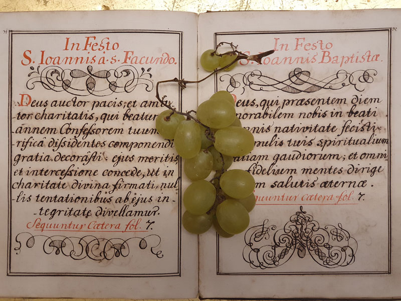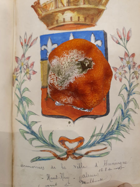 Le « vivant » délicatement déposé sur « le passé » (qu’il oblitère en partie) évoque la morsure du temps, la dégradation qu’il lui inflige (comme dans ces fruits ou légumes en cours de pourrissement) pouvant être un danger pour le fragile manuscrit.