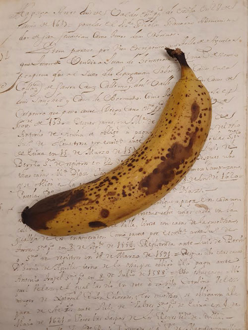Brian Finch : Un texte, pour qu’il donne une clé de lecture, doit être lu intégralement. Or, dans mes œuvres, on ne voit que des fragments de manuscrits. Par exemple, le manuscrit que j’ai utilisé pour la banane est un recueil de testaments d’une même famille qui commence en 1332 et finit en 1895 : il a plus de 200 pages. Mais en le lisant intégralement, on comprend l’histoire de cette famille, ses déboires, la haine ou l’amour qui les a liés, les vengeances, les peurs et les espoirs... Bref, la vie.