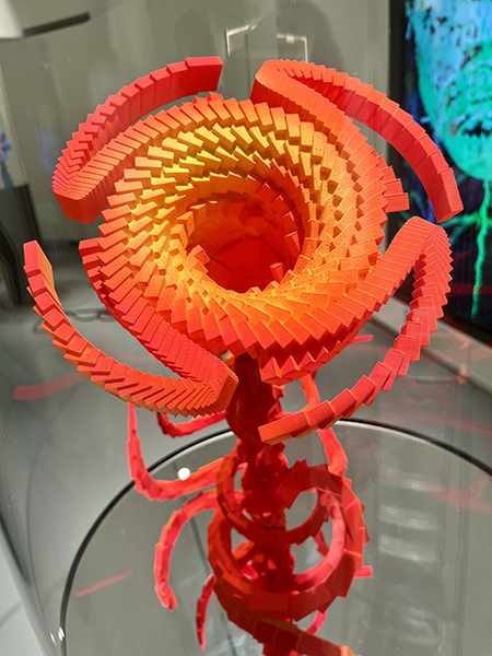 Sur les deux niveaux du centre d’étranges fleurs, à la croisée du végétal, du minéral, de l’animal et de la robotique, évolueront à travers leur représentation sur différents supports technologiques : mouvantes sur des écrans LCD, elles se fixent sous forme de sculptures réalisées en impression 3D ou réapparaissent en hologrammes. L’impression digigraphique permet également une matérialisation numérique, de leur naissance à leur disparition.