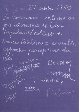 Parce que le 27 octobre 1960, chez Yves Klein, à Paris, rue Campagne-Première, Pierre Restany faisait signer le Manifeste du Nouveau Réalismeà un certain nombre d’artistes révolutionnaires, dont deux Niçois, Arman, Klein, et un natif de Golfe-Juan, Martial Raysse. Les autres étant Tinguely, Hains, Dufrêne, Villeglé, Spoerri. Absents ce jour-là, César et Rotella faisaient quand même partie du groupe. Deschamps, Christo, Niki de Saint-Phalle les rejoindraient.