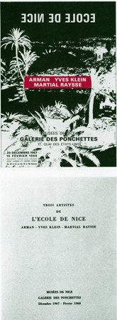 – Neuf mois après cette exposition fédératrice, du 20 décembre 1967 au 5 février 1968, Arman, Klein, Raysse exposent à la Galerie Municipale des Ponchettes, non pas sous la bannière du Nouveau Réalisme, mais sous l’intitulé « Ecole de Nice : Arman, Yves Klein, Martial Raysse ».