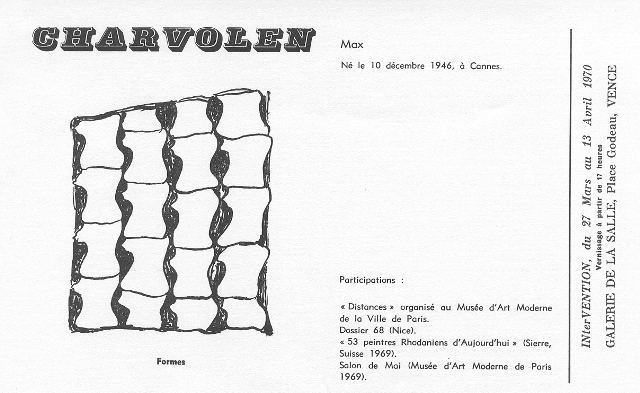 Mais Max Charvolen s’expliquant toujours si bien sur son travail, sa vie, écoutons ce qu’il en dit dans les mêmes « Portulans… » sous le titre « Quelques cm2 de repères » : Je suis né à Cannes en 1946. Le premier moment important est mon entrée à l’école des Arts Décoratifs de Nice en 1964. J’y fais la connaissance de Maccaferri, Miguel, Dolla. Viallat y enseigne. Je poursuis mes études à partir de 1966 à l’École des Beaux Arts et d’Architecture de Marseille, que dirige, avec une grande ouverture d’esprit, François Bret. Une date importante et facilement repérable pour moi est 1967. C’est l’année où la galerie des Ponchettes, à Nice, présente l’œuvre de Klein que je vois donc pour la première fois. Cette exposition a une grande importance car à partir de ce moment là, j’ai commencé à percevoir le monochrome comme un objet contenant toutes les formes possibles. La période 1968 m’amène à nouer ou renouer des relations de travail ou d’exposition avec Alocco, Dolla, Maccaferri, Miguel, Monticelli, Viallat... notamment à travers le groupe INterVENTION Je participe au « Dossier 68 » avec Alocco, Ben, Biga, Cane, Dezeuze, Dolla, Monticelli, Pagès, Saytour, Viallat...