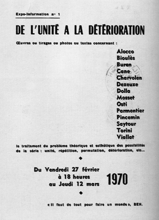 C’est dans ce contexte qu’il prend part, à la fin des années soixante, à l’une des dernières aventures historiquement repérées comme d’avant-garde dans notre pays : le retour analytique et critique de toute une génération d’artistes aux moyens et objets de la peinture après les détours par l’objet de consommation (Nouveau réalisme) ou l’attitude (Fluxus).
