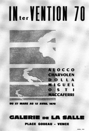 Formation du Groupe 70 avec Chacallis, Charvolen, Miguel, Isnard et Maccaferri. Cela se passe dans l’appartement de Chacallis, dans le Vieux Nice. A cette occasion, le groupe réalise sa première exposition dans l’appartement. On a fondé le groupe parce qu’on avait les mêmes préoccupations picturales et aussi pour se serrer les coudes par rapport à l’extérieur (Isnard). Jusqu’à présent, la peinture a été envisagée sur un plan de toile et de châssis. Certaines recherches actuelles sont au contraire caractérisées par le besoin de sortir de ce plan remettant en cause l’image. A partir de ce moment, il n’y a plus de limites, toutes les possibilités sont envisageables (espace). Je pense que cette richesse de possibilités mérite que l’on s’y intéresse. (Charvolen).