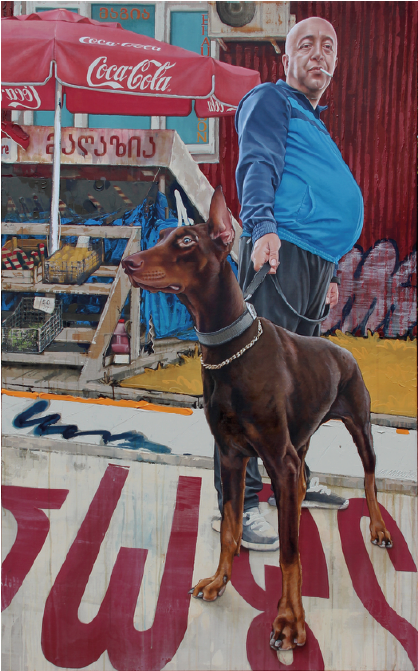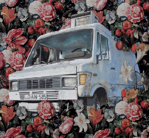 peinture méticuleusement élaborés sur des motifs floraux répétitifs ou des tissus particuliers. Ces détails que l’on découvre petit à petit face aux oeuvres donnent une structure supplémentaire, mais surtout une profondeur qui apporte réflexion sur ces acteurs de la rue, qui n’y passent pas, mais y survivent, et que Matthias Mross a décidé de représenter.