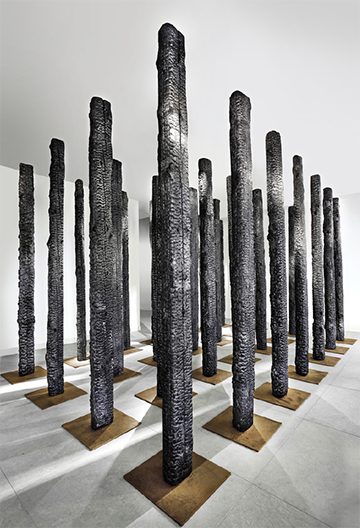 Le parcours se poursuit au coeur de l’Hôtel de la Tour de Brau avec une autre installation intérieure plus intime à l’artiste, une version brute d’un noir profond composée d’arbres carbonisés. À travers ces silhouettes majestueuses érigées vers le ciel, les arbres sont ramenés à la vie pour retrouver toute leur grandeur et leur noblesse d’origine en nous rappelant notre incivilité à leur égard.