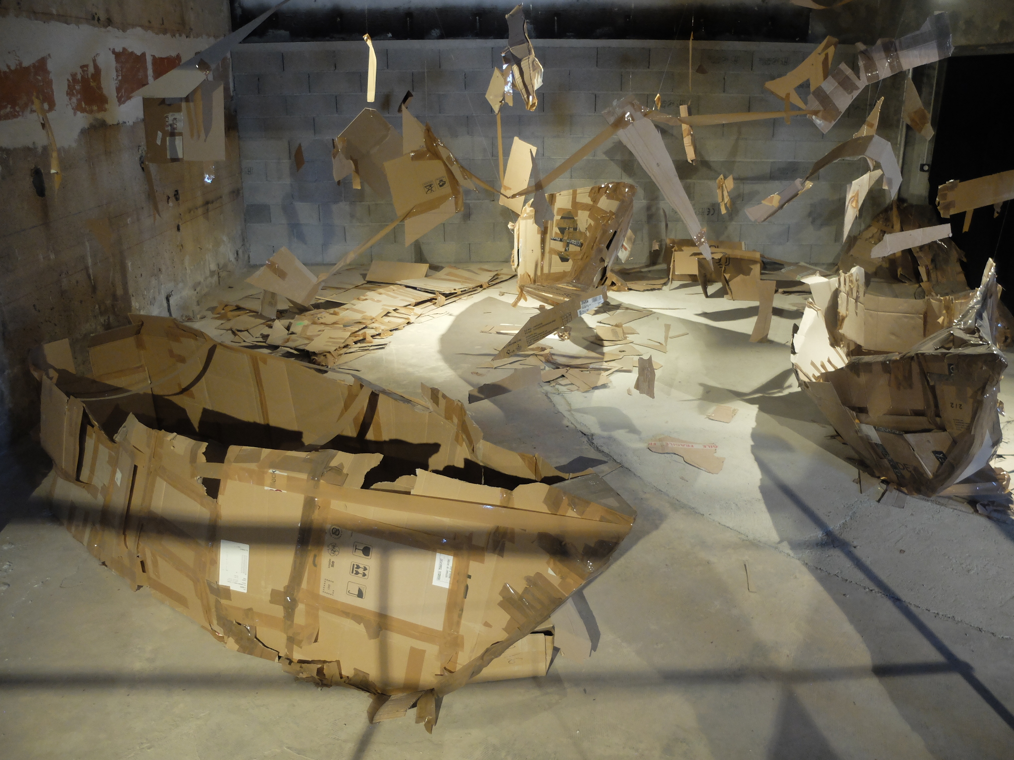 Quant aux bateaux de fortune utilisés par les migrants, Adel Bentounsi avec son œuvre « Barques Désemballer » insiste sur la fragilité de ces embarcations, ses barques fabriquées en cartons d’emballage dégageant une grande émotion.