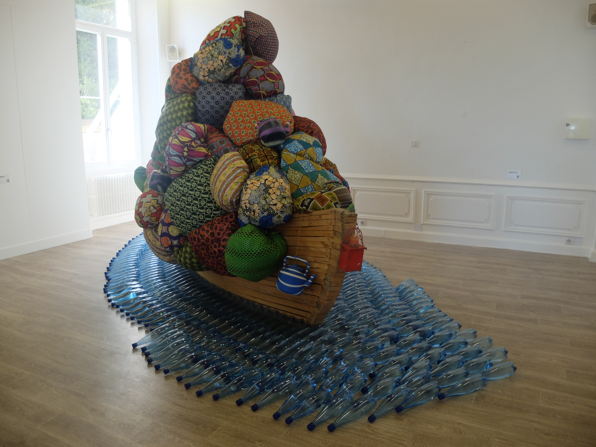Celle de Barthélémy Toguo chargée de ballots de linges colorés montre également la précarité de la condition des exilés qui fait contraste avec l’exubérance des couleurs des tissus.