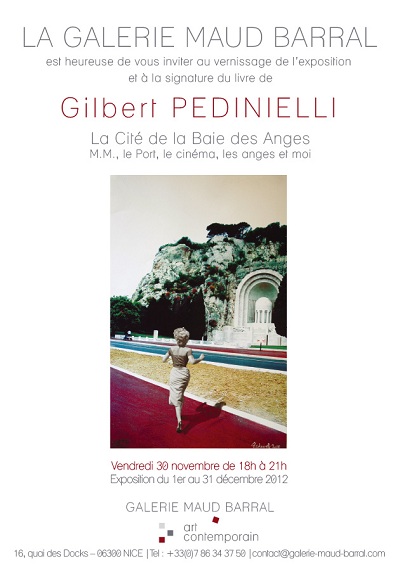 Le 30 novembre 2012 à , Gilbert Pedinielli exposera à la Galerie Maud Barral et signera son livre ’La Cité de la Baie des Anges’, ’M.M., le Port, le cinéma, les anges et moi’