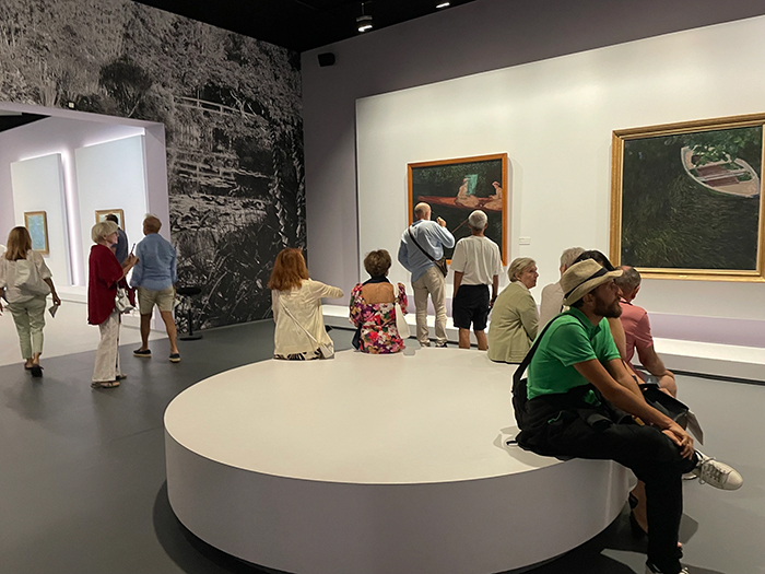 La scénographie prenait soin du visiteur, de petits canapés bleus l’accueillaient pour contempler les œuvres et écouter des citations de Monet interprétées par un acteur dont la voix discrète, sortait du mur.