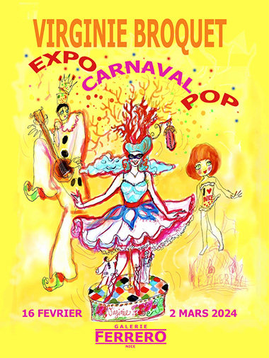 Habituée de la Galerie Ferrero où elle a présenté en 2009 une grande exposition « Nice : Clichés et Anecdotes », Virginie Broquet y offrira cette année, dans le cadre du thème carnavalesque « Pop », des dessins, des toiles et des poupées aux vibrantes couleurs.