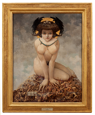 La perversité concupiscente et le regard magnétique prouvent la satisfaction voluptueuse de « La Sirène repue » de sang, tel un vampire. Ce démon ailé porte entre ses deux seins un médaillon aux armes de la ville de Nice, dont quelques monuments reconnaissables surnagent autour d’elle. « Salomé » surmontée par une tête de Saint Jean à la fois tragique et amusant. Avec des têtes de mort sur sa tête et des vautours, la femme écrase les hommes dans « Elle », on peut détailler l’expression du vieillard libidineux de « David et Bethsabée », contempler « Sainte Marguerite terrifiant le dragon », et s’attarder sur l’oeuvre provocatrice d’une femme clouée sur la Croix,...
