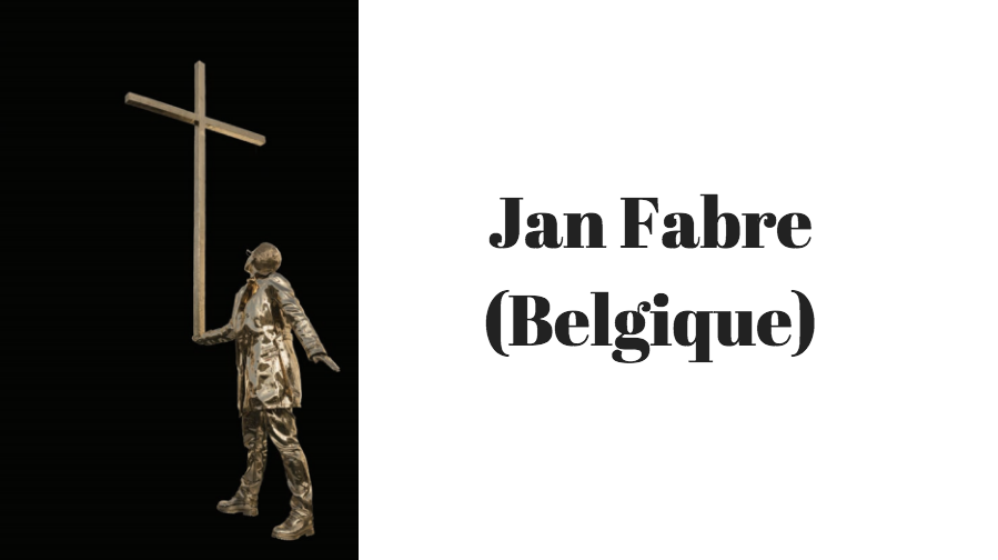 Jan Fabre est plasticien, artiste de la scène, auteur. Son travail lie une mythologie personnelle, avec ses propres règles, ses lois, ses symboles et ses personnages, comme le « guerrier de la beauté / le chevalier du désespoir », avec l’histoire du monde et des arts. Il se décline en une très large gamme de matériaux, considérés pour leurs propriétés, tant physiques que symboliques. Il peint avec son propre sang à l’aube de sa carrière, réalise des pièces au bic, ou bien emploie des insectes et leurs carapaces – influencé par le travail de l’entomologiste Jean-Henri Fabre (1823-1915) – notamment pour le revêtement du plafond de la salle des Glaces du palais royal de Bruxelles, Heaven of Delight (2002) inauguré en octobre 2002 qu’il a recouvert des élytres de 1,4 million d’élytres de scarabées-bijou. Il réalise aussi des sculptures en os, en verre de Murano, avec des animaux empaillés, en marbre. La métamorphose constitue l’un des concepts clés traversant la pensée et l’œuvre de Fabre, où le monde animal est constamment en interaction avec le genre humain et ses représentations. L’Homme qui porte la croix (2014) est une sculpture en bronze représentant un homme faisant tenir une croix en équilibre dans le creux de sa main. « Croyons-nous en Dieu, ou ne croyons-nous pas ? La croix qui tient en équilibre sur le bras de l’homme cristallise cette question », avait déclaré l’artiste lors de l’installation permanente de l’œuvre dans la cathédrale d’Anvers. L’équilibre n’est jamais aussi beau qu’à son point de rupture.