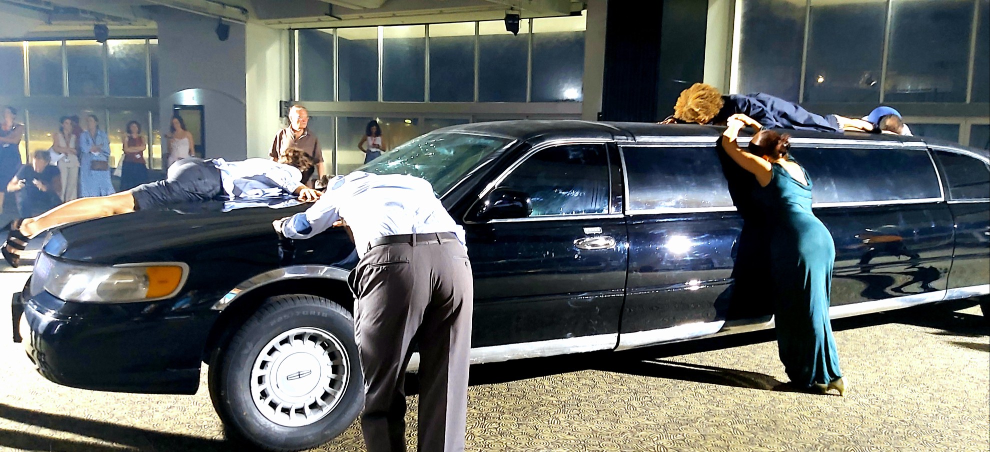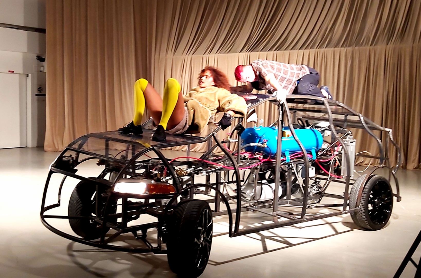 Ils apportent un regard critique et pas uniquement esthétique sur la société actuelle, aussi la voiture prend-elle une place prépondérante : il y a une immense limousine accidentée autour (ou sur) laquelle rampent des performeurs morts ou blessés, assommés par la situation... Il y a aussi cette carcasse d’auto qui est une véritable sculpture métallique toute en ferraille sans carrosserie et sur laquelle (ou avec laquelle) des performeurs dansent amoureusement et gesticulent tandis que la ferraille cahote, grince, soupire, gémit, jouit ... et même danse elle aussi.