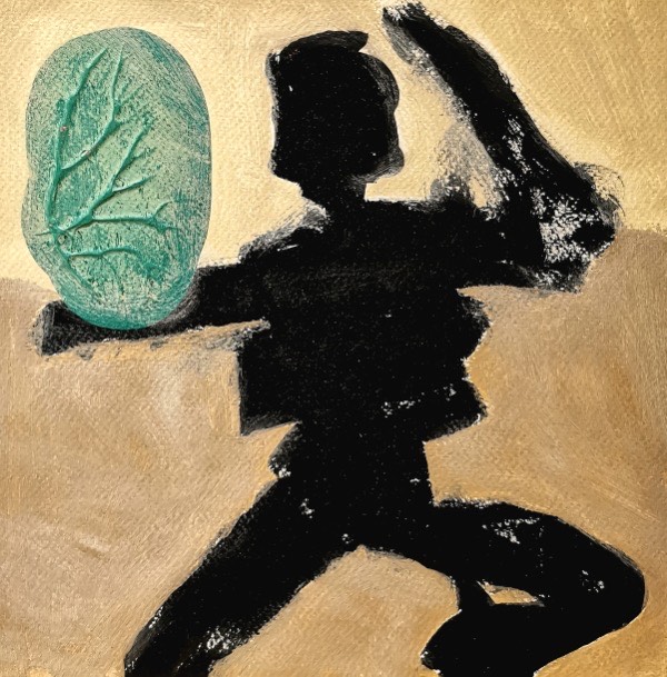 Ses décalages se retrouvent ailleurs : dans les tissus déchirés, repris au fil, fixés sur un châssis blanc, ou dans les vieilles dentelles familiales qu’elle repeint, réorganise, refait vivre autrement. Même nécessité dans ses « essuyages » : sauver la peinture encore attachée aux poils du pinceau, la libérer sur une toile ou une feuille. Alors surgissent des formes anthropomorphes, silhouettes sauvages, graffitis involontaires, nés du hasard et du reste, empreints d’une vérité brute, en marge de la pensée.