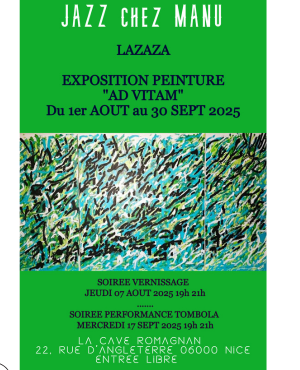 Exposition « Ad Vitam » jusqu’au 9 novembre, chez Manu à la Cave Romagnan, 22 rue d’Angleterre à Nice.