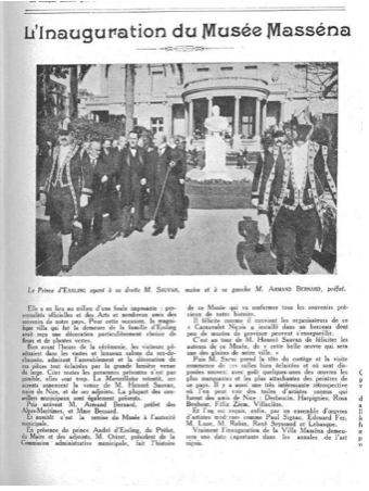 Trésor du patrimoine niçois, le Musée Masséna est inauguré en grande pompe le 28 janvier 1921 en présence de toutes les personnalités qui comptaient à l’époque. Ce « Carnavalet niçois », tel qu’aimaient en parler les journalistes, est installé dans la somptueuse demeure, liée au maréchal d’Empire André Masséna, et construite par son petit-fils Victor Masséna, prince d’Essling, à la fin du XIXème siècle. Cet événement a été rendu possible grâce à la générosité de son fils et héritier, qui a voulu en faire un Musée d’Art et d’Histoire de la Ville de Nice. Depuis cent ans, cet édifice remarquable s’attache à faire revivre la belle époque de Nice à travers son projet scientifique. Ces orientations sont atteintes par la diversité des expositions temporaires et la richesse des collections allant de la Révolution aux Années folles.