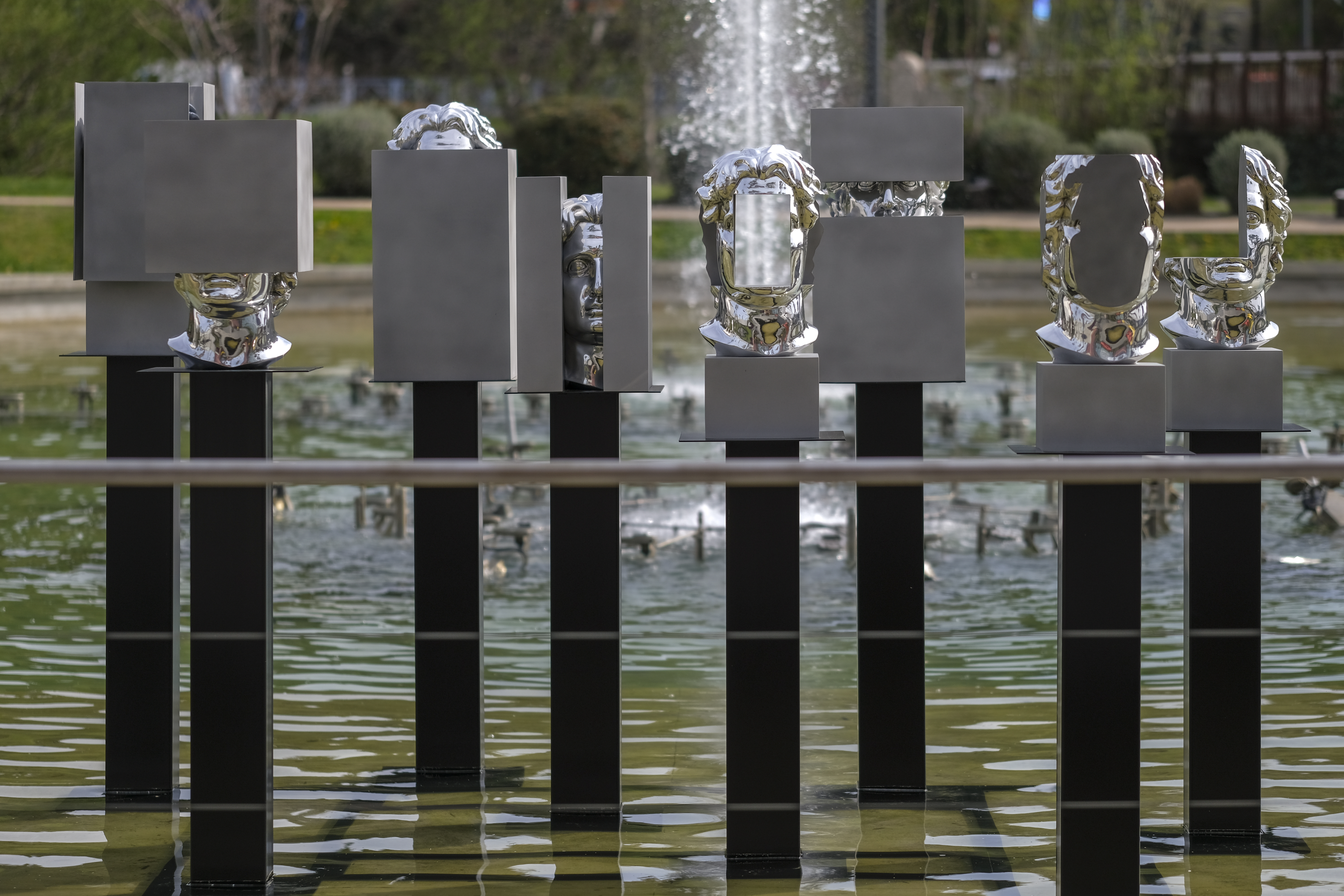 Vénus rouge dite « Sortie des eaux », « Tête Carrée à ciel ouvert », « Colonne aux quatre vents », « Venus de Milo » jaune, de profil, « Drapé dans le vide », « Cheval de Gansou », ses « Hommes qui marchent » ses « Bancs » de concertations ainsi que sa superbe installation « Huit Manières de filer la soie » émergeant d’un bassin avec les jets d’eaux à l’arrière-plan. La plupart de ces œuvres vivement colorées font contraste avec le vert d’une végétation bien présente. Sacha aurait été heureux de voir ses sculptures accompagner son placide mais néanmoins attentif Guetteur.