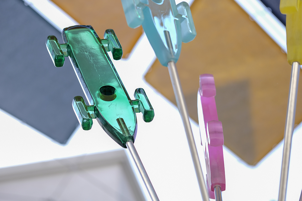 Issues de l’automobile, cylindres, bielles, amortisseurs, calandres, soupapes, sont par ses mains élevés au rang d’objets d’Art. Déplacés, réinterprétés, réassemblées, elles prennent la forme d’araignées, de vagues, d’escargots, de fusées, ou, pourquoi pas, de sucettes aux couleurs pastels.