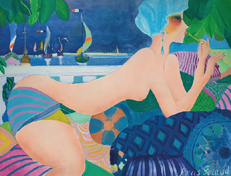 Mondrian, Klimt, Miro, Duffy, Delaunay…ont inspiré la main du peintre Louis Féraud. La nature provençale, le bleu de son ciel, les nuages blancs, « les roses, bleus, jaunes, gris, mauves et les essences rares comme le pistil des fleurs » glissent de la nature à sa palette, puis à la toile, de la toile au tissu, au foulard, au vêtement dont le couturier va bientôt habiller dans son atelier ces longues femmes encore nues sur la toile, qui semblent attendre, les yeux mi-clos, la parure qui leur est promise.