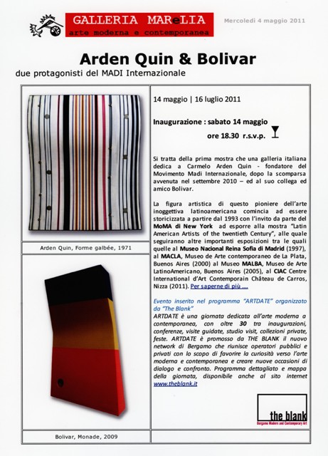 Et s’occuper d’Arden Quin, c’est subir la frustration de ne pouvoir être exhaustivement avec MADI International contemporain, qui ne cesse de se manifester, comme il le fit récemment en avril au dernier Salon des Réalités Nouvelles, avec Dominique Binet, Jean Charasse, Joël Froment, Sakae Hasegawa, Yumiko Kimura, Mitsuko Mori, Torsten Ridell, Saint-Cricq, Satoru Sato, János Szász Saxon, Philippe Vacher, Helen Vergouwen, Piergiorgio Zangara (tous ceux-ci faisant partie de l’exposition du Centre International d’Art Contemporain, Château de Carros, intitulée « Conscience polygonale, De carMelo ArDen quIn à MADI contemporain »), ou, du 20 avril au 25 mai, au Palais de Glace, Maison de la Culture de Buenos Aires, dans « Madi International Argentine/Uruguay/Brésil » (avec, de ceux qui exposent au CIAC de Carros : Arden Quin, Blaszko, Bolivar, Martin et Pepe Cacerès, Facio, Castro, Galvaõ, Marinho, Monferran, Prestach, Ramaglia, San Martin, Stafforini, Tommaseo), et encore dans celle déjà citée, intitulée « Noir et Blanc Madi » à la galerie Kanalidarte, Brescia, terminée le 30 avril, ou encore (decq1 : Arden Quin/Bolivar à la Galleria MAReLIA) par le duo « Arden Quin/Bolivar » à la Galleria MAReLIA de Bergame, du 14 mai au 16 juillet 2011.