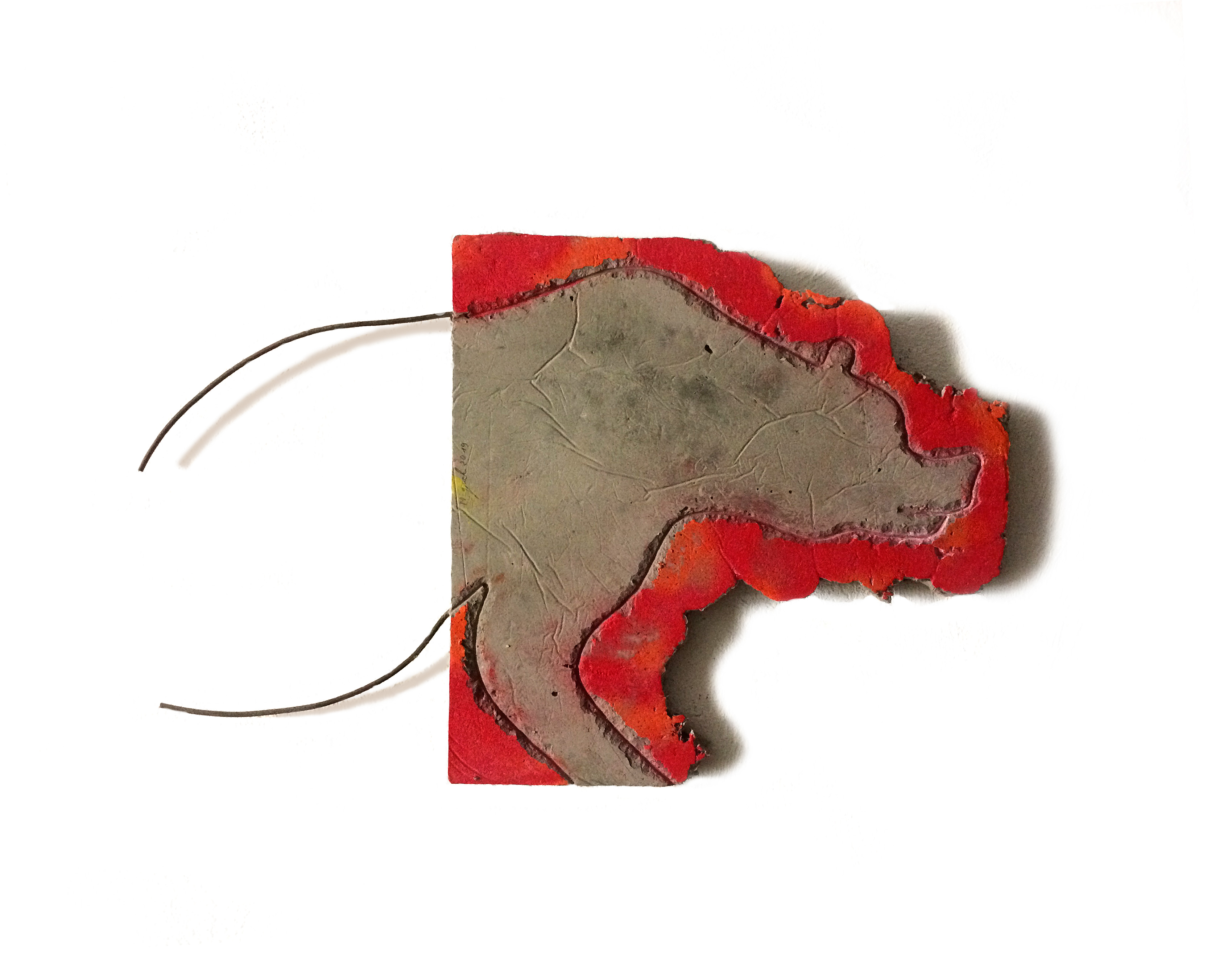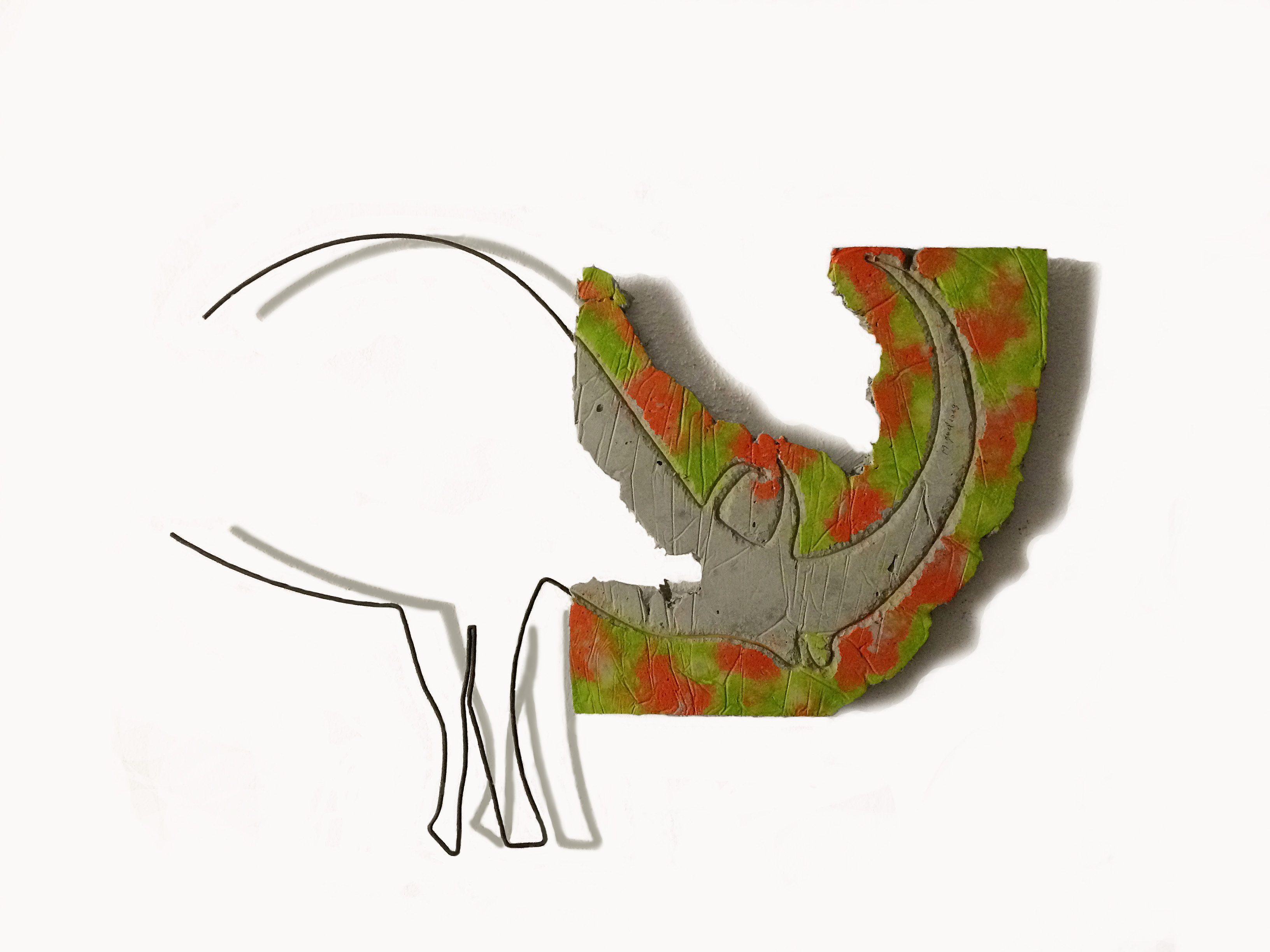 Dans sa pratique actuelle, le contour en fil de fer dessinant une forme animale issue de la préhistoire est placé sur un support qu’il recouvre d’une matière complexe à base de pâte à papier ou de béton composée de gravier, de sable, de ciment et d’eau, intégrant divers déchets et pigments colorés.