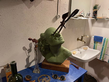 Outre les reliefs de repas collés sur des planches et mis à la verticale, on y voit de vieux outils, des instruments de cuisine (batteurs mécaniques), des couverts, bouteilles, assiettes, etc., faisant partie de son quotidien. « Les objets me trouvent plus que je ne les cherche », dit-il.