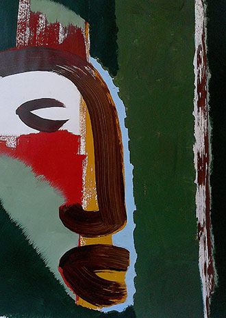 Le masque et sa fonction de cacher un visage en dévoilant une expression est une pratique vieille comme l’homme : magique, mystique, associé au théâtre dont il est le symbole. Maubert en a peint des centaines, peut-être des milliers. Si la figure est encore présente, elle apparaît plutôt comme un souvenir vague, ancien, primitif.