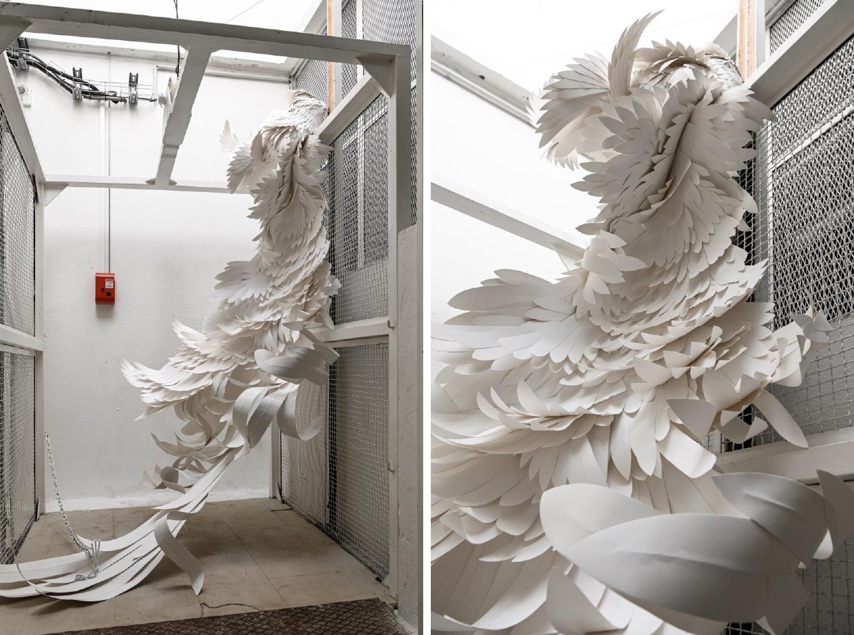 La kyrielle de plumes en papier qui se déploient dans les espaces du Suquet des Artistes témoignent de sa minutie et de son engagement. Ces assemblages transforment l’espace et invitent à le voir sous un jour nouveau. L’artiste ne se contente pas de proposer des œuvres pour les murs, elle habite le lieu jusque dans ses recoins les plus cachés.