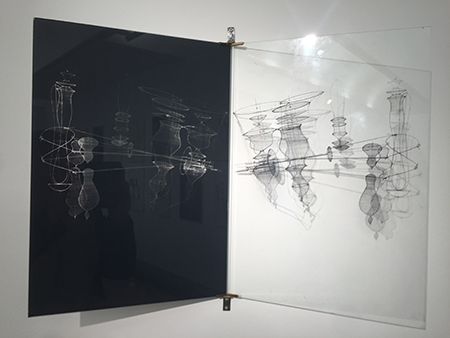 Dessins abstraits avec un motif qui se dédouble, dispositifs fixes ou cinétiques composés d’acier, de verre et de carton, occupant parfois une salle entière en projetant sur les murs un théâtre magique d’ombres... Nous sommes invités à méditer dans le silence sur une forme inédite de poésie, où la lumière, l’ombre et le mouvement jouent leur propre jeu de manière autonome.