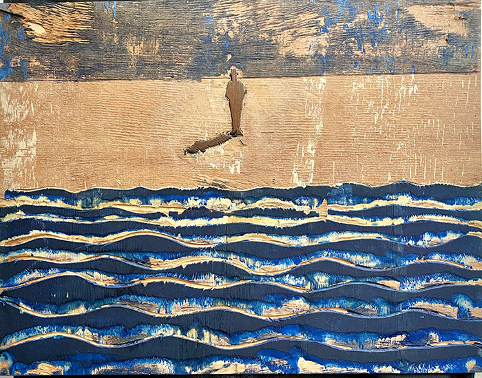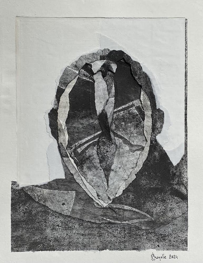 Louis Dollé, artiste multi-disciplinaire, animateur de ce lieu rare à Nice où enseignements, manifestations festives, expositions, performances, etc., ont lieu chaque année, a choisi de rendre hommage à ces deux artistes dont il a voulu confronter les travaux : pour Denis Gibelin, il a réalisé un portrait sculpté de l’artiste debout au milieu de son univers marin ainsi que des gravures rehaussées de vagues bleues. Pour Nathalie Broyelle, il a créé une belle gravure très fouillée qui représente sa silhouette émergeant d’une forêt d’arbres-tentacules très charnus qu’elle semble maîtriser (tirée en encre noire et rouge).
