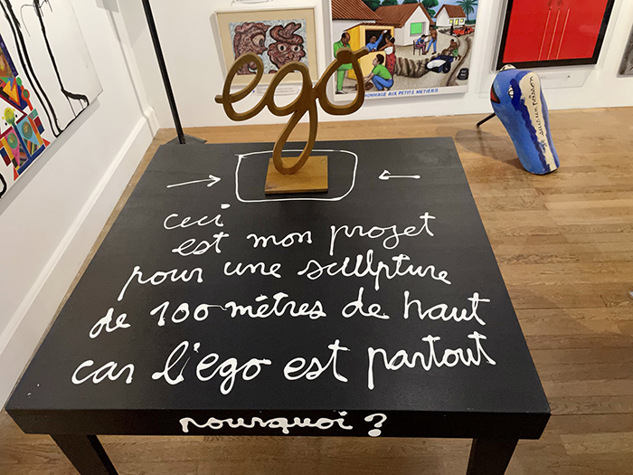 On y retrouve ses thèmes récurrents : les femmes, les ethnies, l’histoire de l’art, l’ego… Et bien sûr ses interrogations par dizaines : il m’a parlé de son projet de faire une exposition où il n’y aurait que des phrases interrogatives.