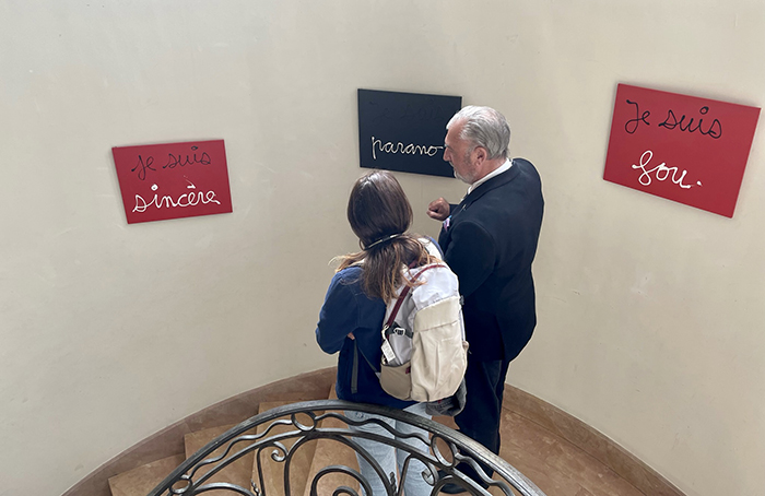 Il y a beaucoup à voir, à lire, à entendre, à photographier dans chaque salle plus ou moins thématisée : un petit salon, une chambre à coucher, un portant avec des robes qu’il a créées, une baignoire, un babyfoot, des tables et des chaises pour discuter ou faire des bras de fer, un petite estrade et un micro pour débattre... La cage d’escalier a été revisitée : les premières marches, on est autiste, puis bipolaire, puis mégalo, parano, etc. À l’extérieur, les jardins accueillent de nombreuses sculptures et un « ring » prêt à présenter des performances.
