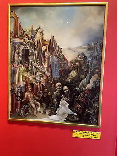 Toutes les œuvres exposées lui appartiennent, à part la superbe peinture de Martine Doytier (voir photo ci dessous) qui évoque le Festival du Nouveau Réalisme à l’Abbaye de Roseland en 1961, exposée en prémice de l’importante rétrospective qui aura lieu en septembre à l’Artistique.