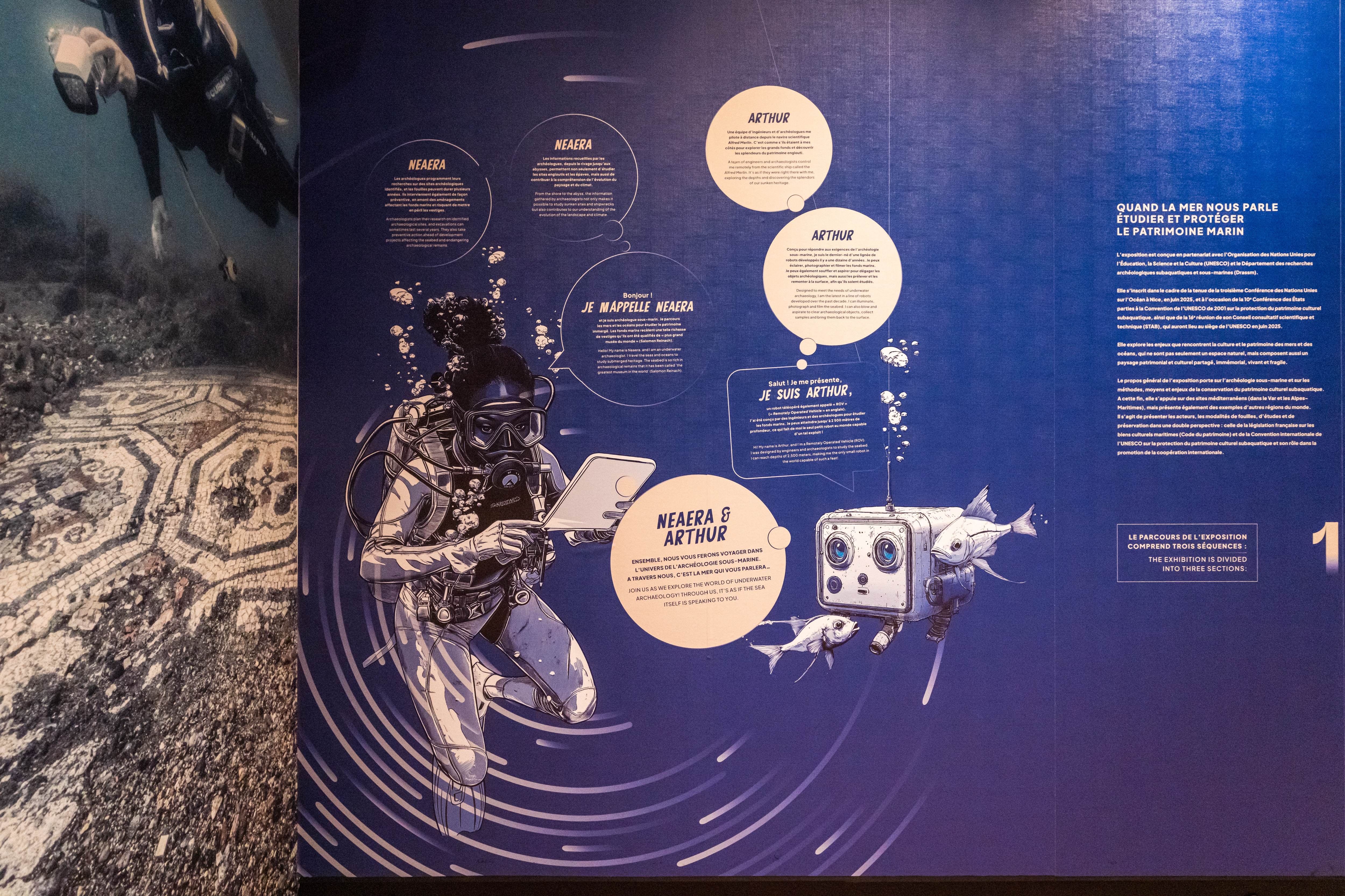 De grands panneaux explicatifs ainsi que des notices et des jeux destinés aux plus jeunes, nous renseignent également sur les modes d’exploration et la technologie complexe nécessaire aux recherches en milieu sous-marin : des fouilles en scaphandre jusqu’aux robots et petits sous-marins qui permettent aux archéologues de repousser les limites de l’exploration sous-marine.