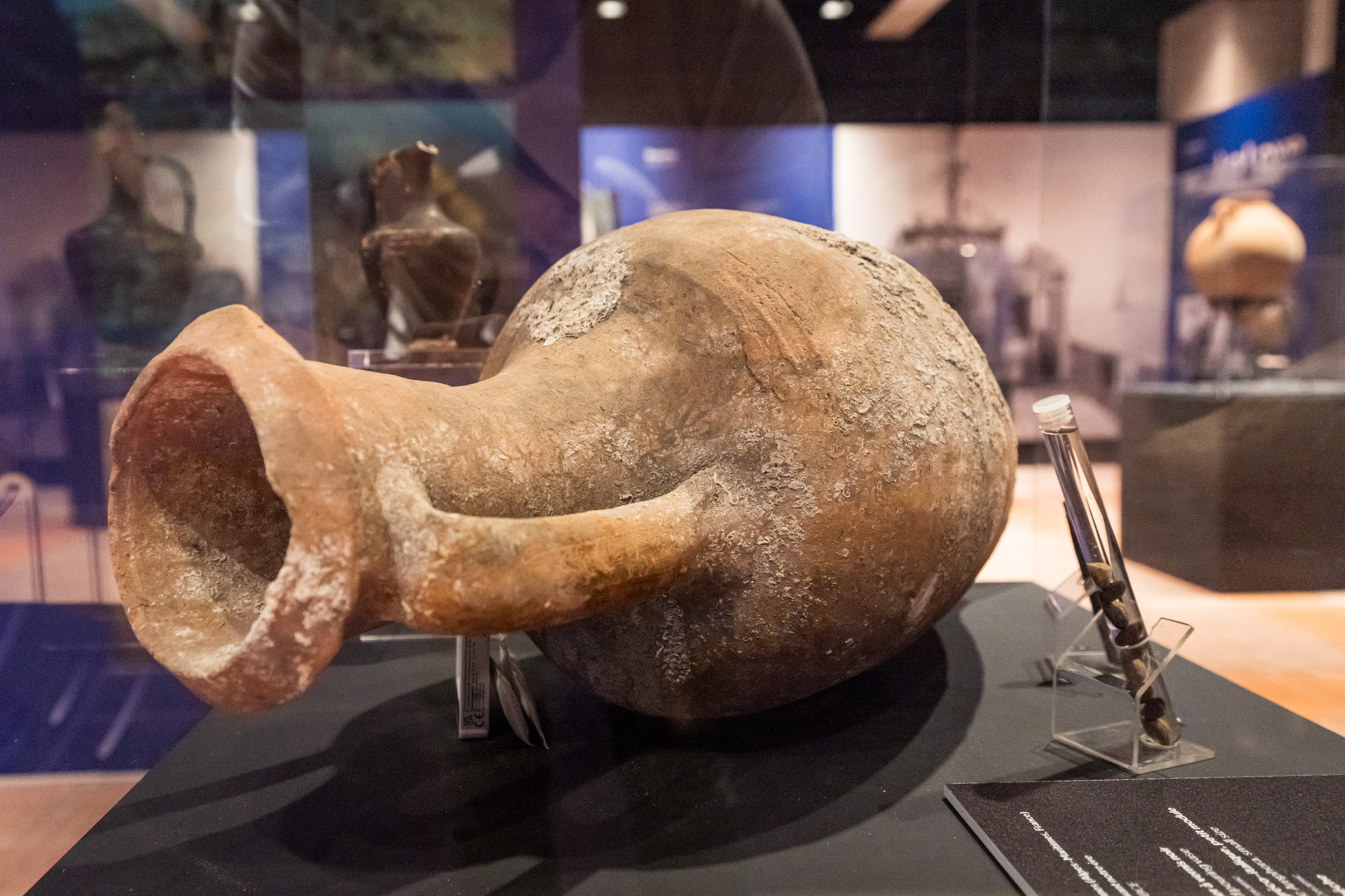 C’est au sous-sol de notre beau Musée d’Archéologie, dans un espace bleuté, immersif que nous découvrons les précieux objets remontés de ces navires : jarres, vaisselles, objets du quotidien, mais aussi armes, bijoux, lingots de plomb, etc.