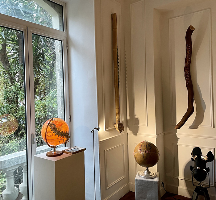 À découvrir également un globe terrestre recousu et taché de noir à l’image de notre monde souillé et à réparer. Est présentée également une installation grandiose sur un trône ouvragé, d’une souche d’arbre torturée portant les orbites d’un crâne humain démesuré d’une planisphère bleue remplaçant l’os occipital.