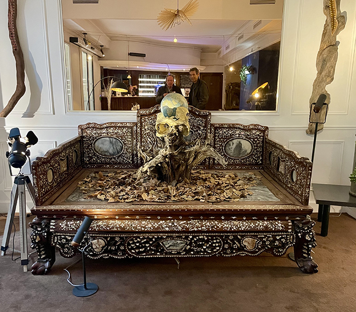 Astreint à une certaine réserve, Nicolas a fait en sorte d’éviter la morbidité d’œuvres composées d’os grâce à une scénographie qui les intègre parfaitement dans le charmant salon.