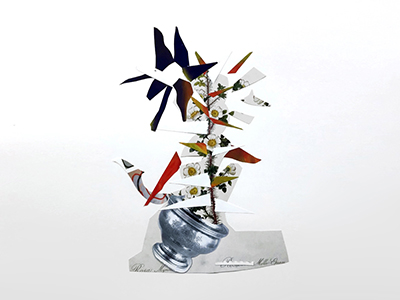 Gerben Mulder (Pays-Bas), qui est connu pour ses “fleurs punk”, nous emmène dans un univers de bouquets contemporains. Il présente une série de collages spontanés et fantaisistes d’un style Bonsaï, des formes découpées et collées à partir de catalogues de vente aux enchères d’oeuvres d’art.
