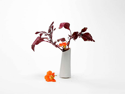 Jana Francke (Allemagne) apporte une touche de volume avec trois vases monochromes en céramique qu’elle appelle vaisseaux. Elle joue avec les contrastes de textures, l’équilibre et les vernis. L’un des vases est soigneusement cassé comme une pétale de fleur qui est tombée de sa tige.