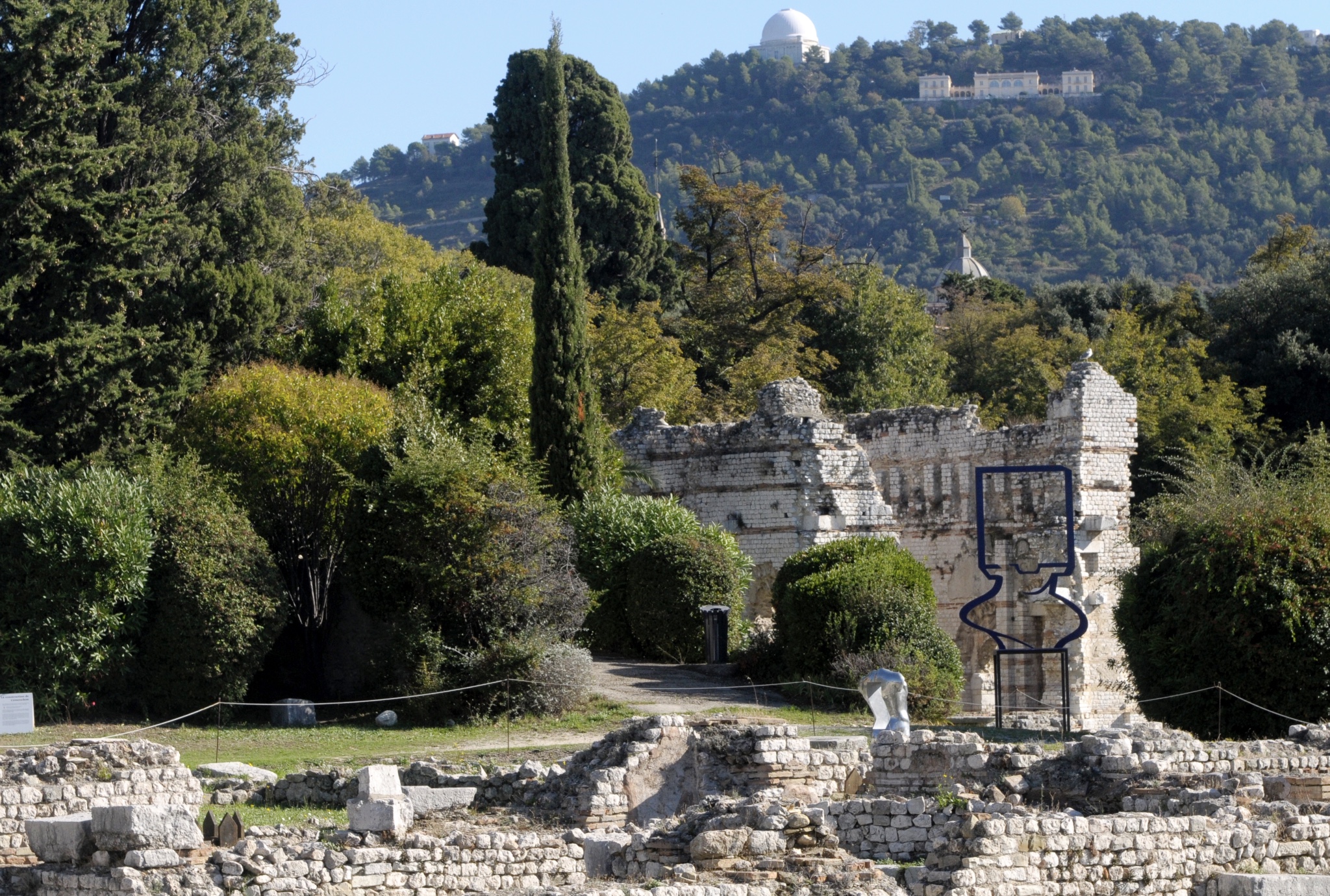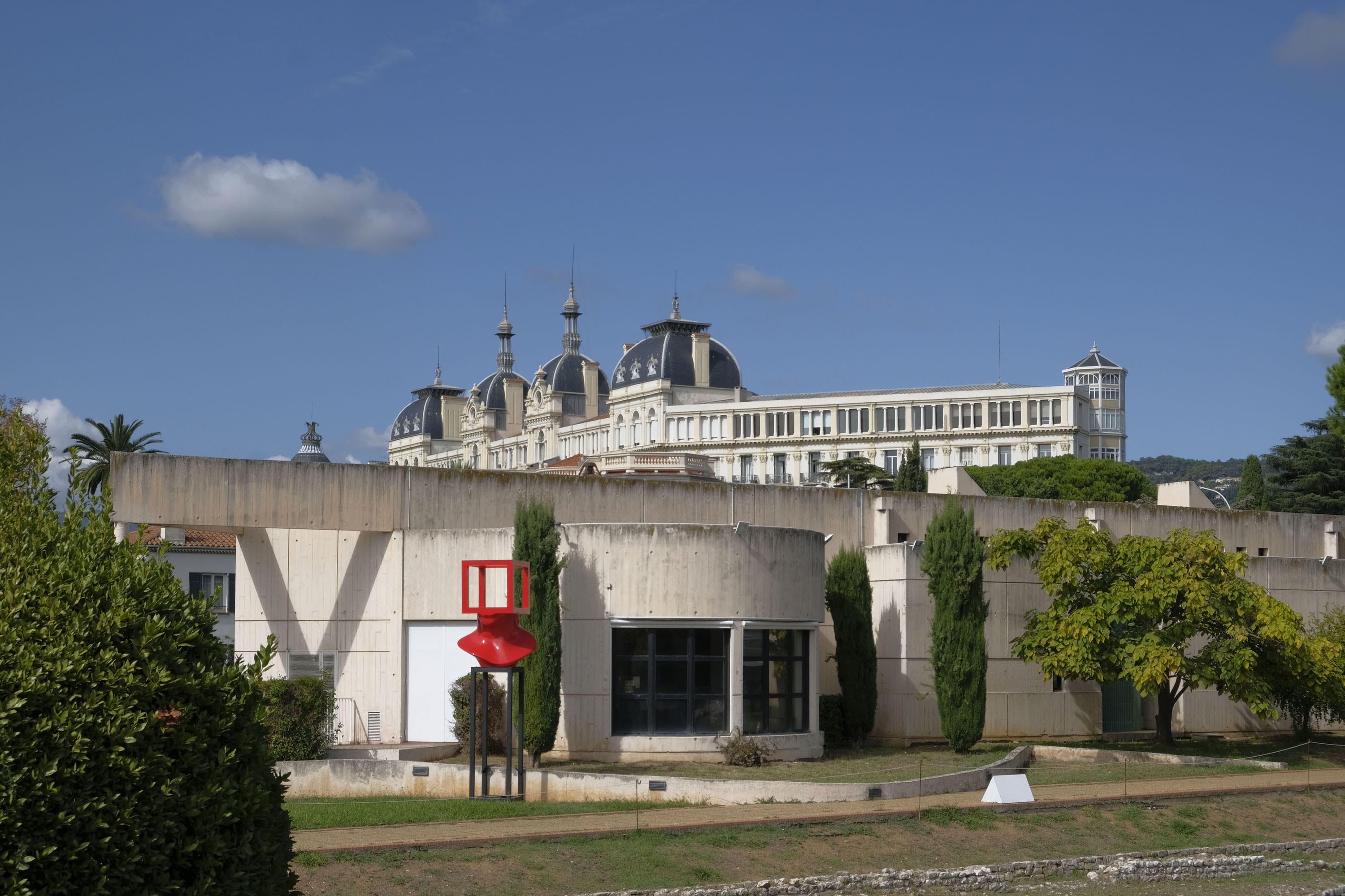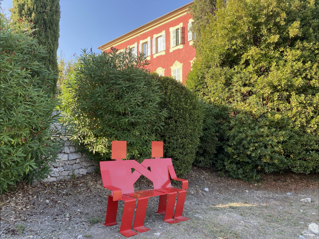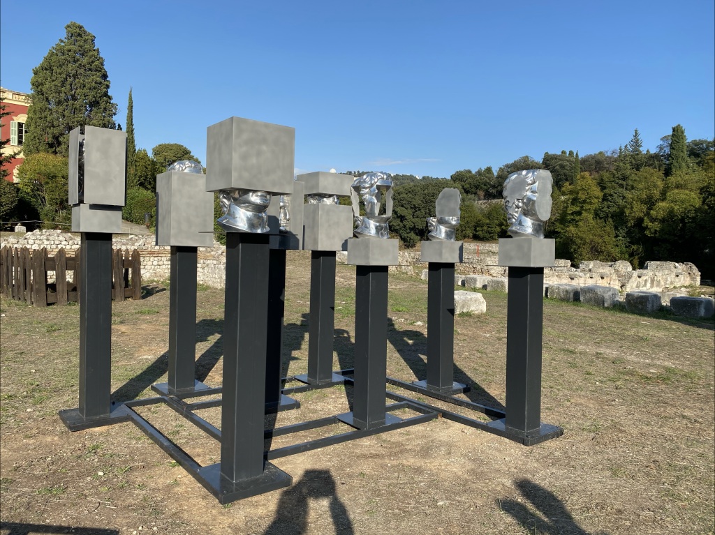Les sculptures dialoguent aussi avec les bâtiments qui enserrent le site : le Musée Matisse, le Regina à l’architecture Belle Époque, et avec la nature environnante : les majestueux cyprès pointus et les oliviers.