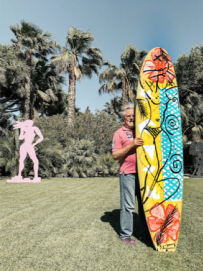 On ne peut effectivement pas re ?sister tre ?s longtemps a ? l’e ?nergie que de ?gagent ces Painting- Boards aux couleurs vives et joyeuses sur lesquels e ?voluent les figures sensuelles du peintre. Le trait opulent de l’artiste souligne les courbes dynamiques de la planche que l’on aime a ? imaginer en mouvement, guide ?e par les impulsions d’un surfeur qui glisse e ?le ?gamment au sommet de la vague.