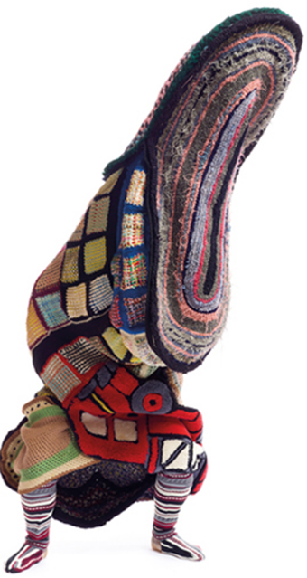 Le textile, en devenant habit, symbolise le corps et son travestissement. Il danse avec Nick Cave, porte en mémoire des événements avec Meschac Gaba, transforme en chasseur avec Jacin Giordano. Audelà du corps, l’art textile permet des glissements sémantiques d’objets familiers, locaux ou identitaires pour racommoder le monde, comme chez Faig Ahmed, Joana Vasconcelos, Pascale-Marthine Tayou ou encore El Anatsui.