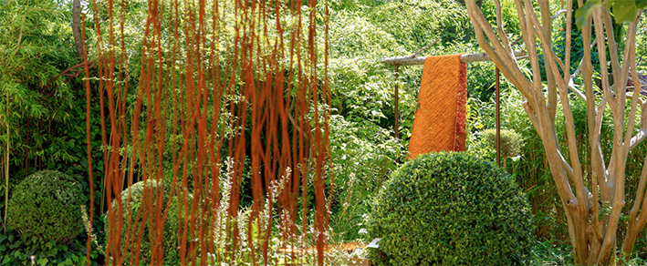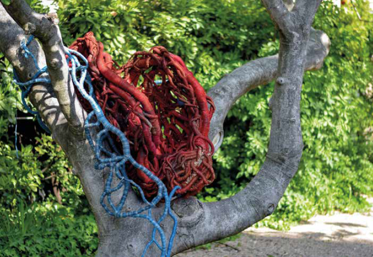 L’art de tresser, sorti du carcan de l’intime, devient monumental avec Elena Redealli, Mireille Fulpius et Lilian Bourgeat. Tisser peut être une trame à l’infini comme dans le travail d’Olivier Bartoletti ou de Rodrigo Matheus. Cette pratique devient une manière de renouer avec le monde naturel. Empreintes des traditions religieuses de par le monde, Awena Cozannet, Aude Franjou et Véronique Matteudi inscrivent leur travail dans ou avec le végétal. Les oeuvres métalliques de Nadya Bertaux, YZO, Odile de Frayssinet, Adrienne Jalbert, Véronique Wirth et Antonella Zazzera condensent, en immersion dans le jardin, la force d’un artde faire féminin, venu briller en art majeur.
