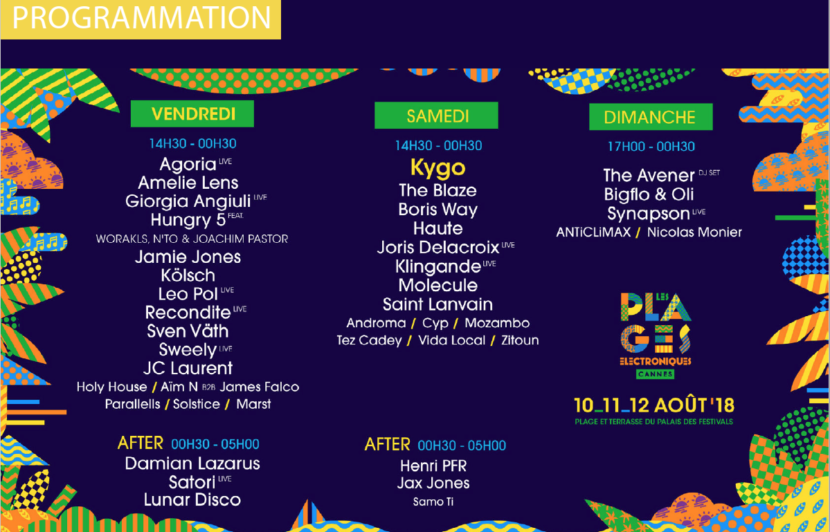 La programmation artistique du festival, par ses choix audacieux et exigeants, garde son ADN oscillant entre découvertes bien senties, artistes pointus, habitués des clubs d’Ibiza, headliners connus de tous, pour qu’afficionados et connaisseurs puissent se réunir autour des musiques électroniques, promettant ainsi une émulation festive sur le dancefloor le plus fou de France et sur une plage public en plein coeur de la ville de Cannes.