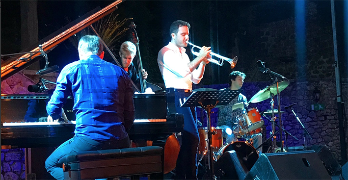 David Enhco a un joli jeu de trompette avec un son délicat et voluptueux, tout en étant triomphant. Dès le début les notes coulaient en nous sensuellement en nous donnant la chair de poule, malgré la chaleur caniculaire. Comme son frère, Thomas Enhco, pianiste renommé tant en jazz qu’en classique, David Enhco est tombé dès l’enfance dans une très riche marmite musicale, avec le célèbre chef d’orchestre Jean-Claude Casadesus comme grand-père, l’illustre cantatrice Caroline Casadesus comme mère et le légendaire – et regretté - Didier Lockwood comme beau-père, le stimulant à jouer d’un instrument déjà tout petit.