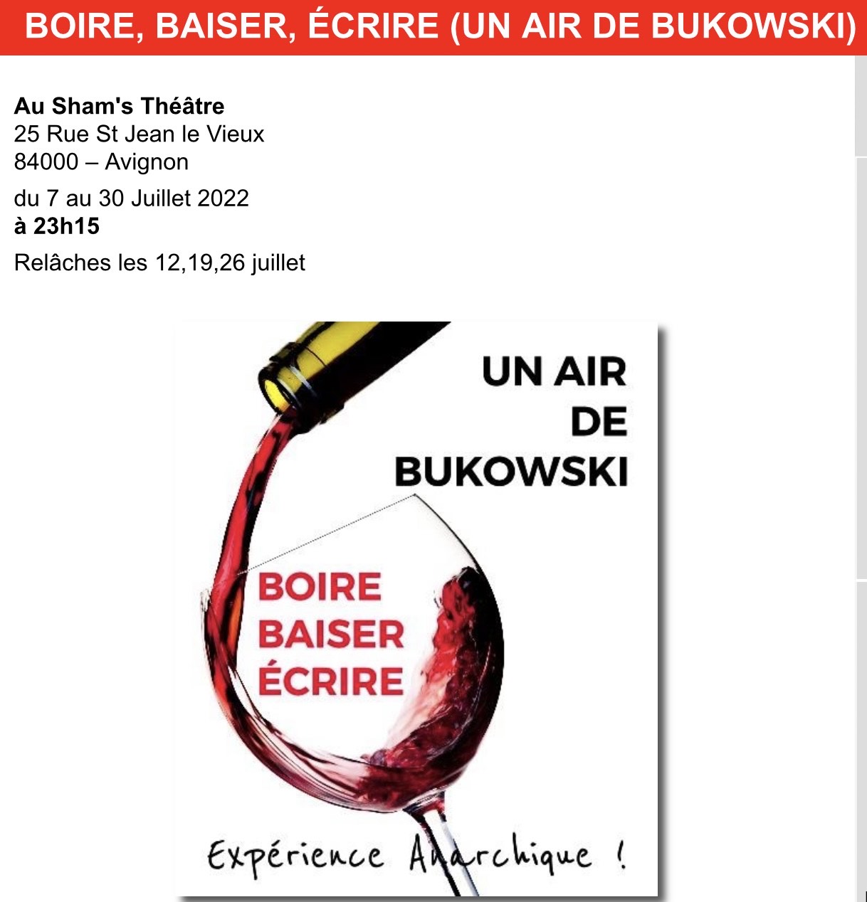A la fin du « spectacle », après tout ce qu’il a bu tout en nous parlant (trois cannettes de bière, un demi-litre de vin rouge et quelques shots de whisky ou de cognac - j’ai compté), il s’assoit devant nous et commence un après-spectacle où il dialogue directement avec le public, où il explique ce qu’il fait, ce qu’il vient de faire ou fera - et on pourrait passer des heures avec lui à parler de Bukowski (qui n’est pas seulement celui qu’on a vu chez Pivot), de la vie, de l’écriture et de l’intime, mais le théâtre doit fermer et il faut bien s’arrêter.